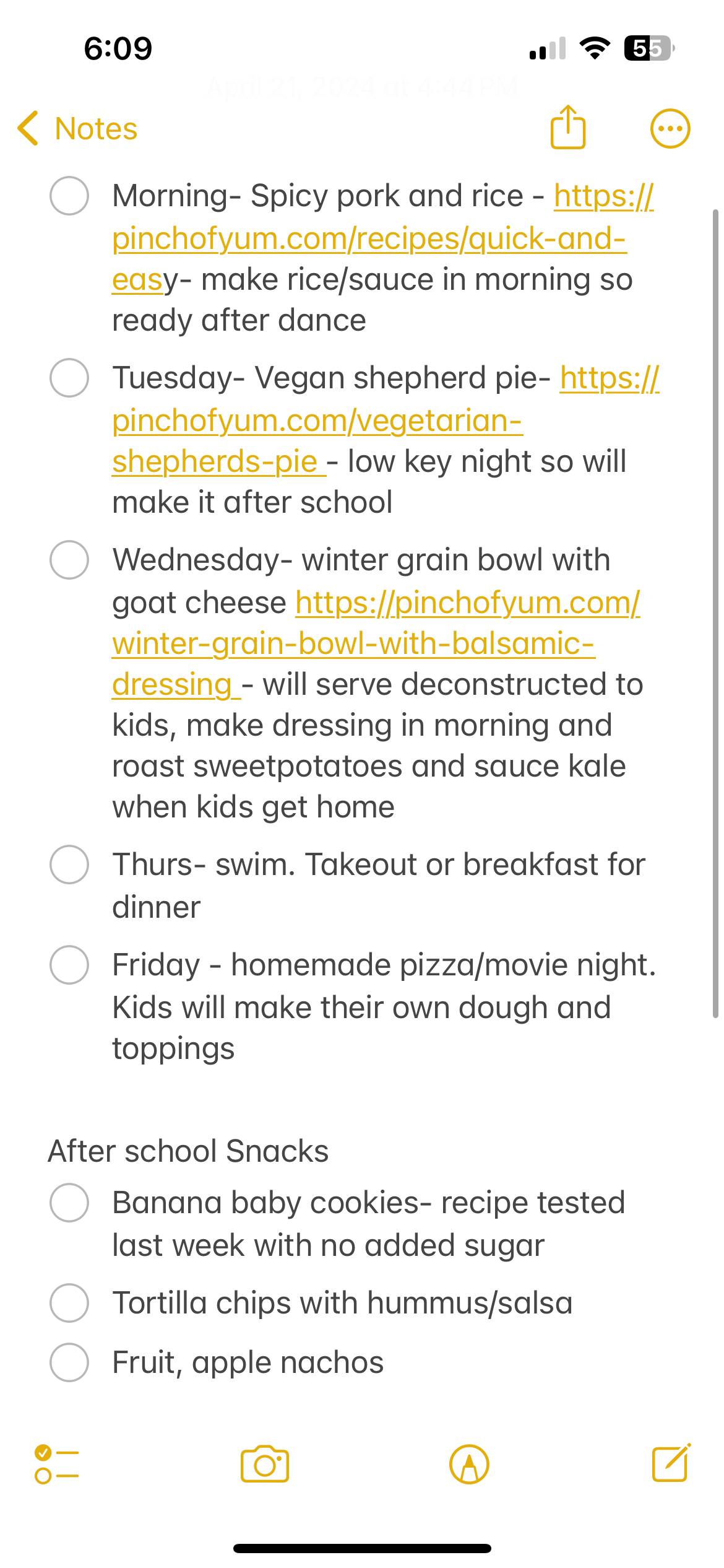 Hi Reader, I'm hoping this email will help simplify meal planning for you. It doesn't have to be all or nothing - like I talk about in my "How to meal prep" ebook (which had several purchoses/5 star reviews over the weekend!) Here is a picture of my notes app that I use to plan our meals. Most of the planning I do is "mental" planning, meaning I try to allocate certain meals we'll make this week based on what we have. Vs. physical meal planning, where you actually make the meals. That works for some people - cooking multiple meals on Sunday. But even the mental planning helps me so much! As you can see, I type out when I'll make parts of each meal. For me, cooking dinner at 5:00 with all 3 kids home can be a nightmare. They are all hungry and need to be entertained, plus I try to have dinner on the table at 5:30. So, if I can do a part of the meal earlier in the day, that really helps! Today, for instance, I'll cook rice while I"m cooking oatmeal for breakfast - easy enough. I will also make the marinade so all I have to do when dinner rolls around is cook the pork really quickly and perhaps heat up a bag of frozen veggies! This mental list helps me SO MUCH! I share many more actionable tips in the meal prep book.